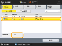 コピーの基本画面で操作パネルの(ストップ)を押すとコピーが一時中断され、<<ストップ>中止するコピージョブを選択します。>というメッセージとコピーの一覧が表示されます。この画面でコピーを選び、<中止>を押してコピーを中止することもできます。