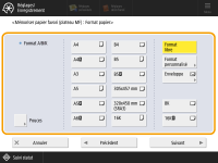 1 | Appuyez sur <Format personnalisé>. ![]() Vous pouvez spécifier la taille de papier <Format libre>, vous n'aurez alors pas besoin d'indiquer le réglage de la taille de papier. Spécifiez <Format libre> lorsque vous chargez du papier de taille inconnue pour faire des photocopies ou lorsque la taille de papier est déjà enregistrée dans le pilote de l'imprimante. |