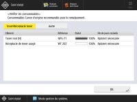 Vous pouvez vérifier la quantité restante de consommables à partir de l'interface utilisateur distante. Vérification du statut de la machine |