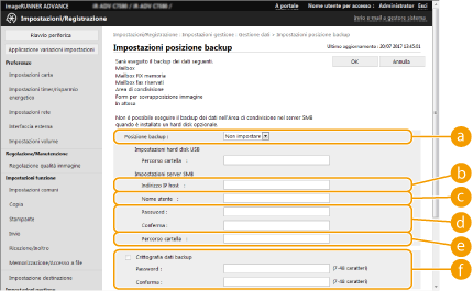 Una volta effettuato il backup, è possibile fare clic su [Registro backup/ripristino] sulla schermata visualizzata alla fase 7 e verificare i risultati del backup in [Risultato]. Se viene visualizzato il messaggio [Errore server.], non è possibile configurare correttamente le impostazioni di rete. Verificare le impostazioni di rete. I dati di backup possono essere ripristinati non solo nella macchina ma anche negli aggiornamenti dello stesso modello. |