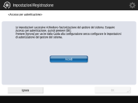 Effettuare un accesso autenticato per configurare le impostazioni che richiedono i privilegi di amministratore. ![]() ![]() Premere <Accedi> e inserire il nome utente e la password di un utente con privilegi di amministratore. Il nome utente predefinito dell'amministratore è "Administrator", mentre la password predefinita è "7654321". Premere nuovamente <Accedi>, quindi premere <OK>. Se si inserisce la password predefinita, compare la schermata che chiede di cambiare la password. È possibile cambiare la password anche in un secondo momento. Accesso come amministratore È possibile saltare le impostazioni che richiedono i privilegi di amministratore e procedere al passo successivo premendo <Ignora>. In questo caso, procedere al passo 11. | |