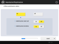 La Guida all'impostazione non può essere avviata nei seguenti casi.Se è impostata l'autenticazione utente o l'autenticazione ID divisione. Se è impostata l'opzione Autentica ID divisione. Se viene effettuata l'autenticazione con scheda. |