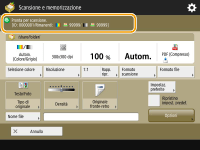 Quando si preme <Scansione e memorizzazione> nella schermata <Home> e quindi si preme <Mailbox>, <Area di condivisione>, <Rete> o <Supporto memoria> per acquisire gli originali, viene visualizzata la seguente schermata di impostazione.