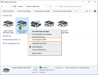 Rechtsklicken Sie auf das Druckersymbol des Geräts, und klicken Sie dann auf [Druckereigenschaften].