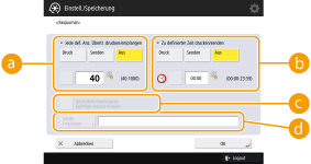 Bei Dokumenten, die per E-Mail gesendet wurden, gibt die Liste das Sendeergebnis zwischen dem Gerät und dem E-Mail-Server, nicht zwischen dem Gerät und dem Empfänger an. Wenn Sie <Ausgabedef. Keine Übertr.> in Schritt 3 auswählen, dann können Sie die Anzahl der Protokollergebnisse, die in der Liste eingeblendet werden, festlegen. Sie können festlegen, ob die Liste automatisch gedruckt werden soll. |