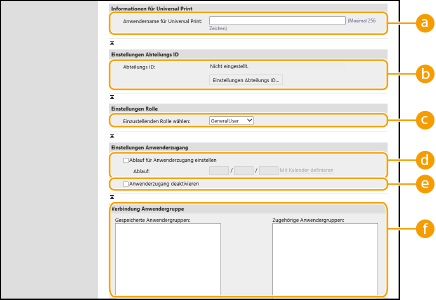 [Verbindung Anwendergruppe]Wenn Sie den Benutzer einer Gruppe zuweisen möchten, wählen Sie eine registrierte Benutzergruppe aus der Liste aus, und klicken Sie auf [Hinzufügen]. Diese Einstellung wird nicht angezeigt, wenn Sie Abteilungs-IDs als Benutzergruppen verwenden.
