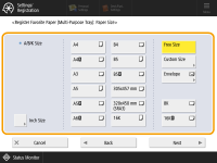 1 | Pulse <Tamaño personalizado>. ![]() Se puede especificar el tamaño de papel como <Tamaño libre>, lo que elimina la necesidad de introducir la configuración del tamaño del papel. Especifique <Tamaño libre> cuando cargue papel de tamaño desconocido para realizar copias o cuando el tamaño de papel ya esté registrado en el controlador de la impresora. |