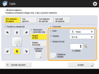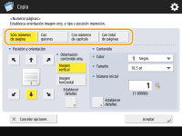 Los números y símbolos no se imprimen en las portadas (Añadir una portada y una contraportada) u hojas insertadas (Insertar hojas y páginas de capítulo (hojas insertadas)). Los números de conjuntos de copias se imprimen en todas las páginas copiadas. Los números de conjuntos de copias se pueden imprimir conjuntamente con las fechas o el texto. <Configuración opc. numerar juegos de copias> El texto para <Numerar páginas> y <Filigrana> también puede seleccionarse del texto que se ha registrado en <Guardar caract. para numerar págs./Filigrana>. Si configura dos de las opciones <Numerar páginas>, <Filigrana>, <Imprimir fecha> o <Numerar juegos de copias> para imprimir en la misma posición, cuando pulse (Inicio) aparecerá un mensaje preguntando si hay que imprimir con estas opciones .Si selecciona <Con números de capítulo> junto con <Insertar hojas>, los números de los capítulos se cuentan de la siguiente forma: Después de insertar cada página de capítulo Después de insertar una inserción de hojas Si establece <Configuración opc. numerar juegos de copias> en <Sí>, la configuración que puede especificar cambia de la siguiente manera. <Configuración opc. numerar juegos de copias> Ya no puede seleccionar <Toda la superficie> y <Números en 5 posiciones> para imprimir posiciones en el modo de numeración de juegos de copia. Los tamaños de los números del modo de numeración de juegos de copia pasan a ser <10,5 pt>, <12,0 pt> y <14,0 pt>. |