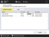 Puede consultar la cantidad restante de consumibles desde la IU remota. Consultar el estado del equipo |