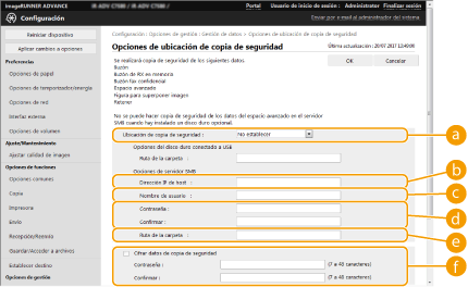No modifique ni elimine los datos de los que se ha hecho una copia de seguridad, ya que podría impedir la correcta restauración de los mismos. No realice una copia de seguridad mientras el equipo está siendo manejado desde el panel de control o la IU remota. |