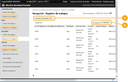Puede utilizar la IU remota para consultar el estado de documentos que están a la espera de ser procesados, así como los registros de los documentos que se han procesado. También puede consultar el estado del equipo, como la información de errores y la cantidad restante de consumibles.