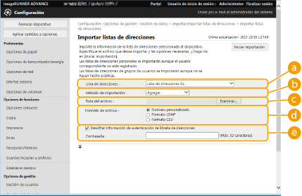 Puede seleccionar opciones concretas para importar o exportar, como listas de direcciones de la Libreta de direcciones u opciones de la impresora. Para realizar estas operaciones tiene que iniciar una sesión con privilegios de Administrador.