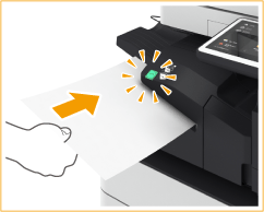 1 | Placez la liasse de papier souhaitée dans la rainure du finisseur interne. Insérez le coin de la liasse que vous souhaitez agrafer dans la rainure, face avant du papier dirigée vers le bas. Dès que la liasse de papier est détectée, le bouton d'agrafage se met à clignoter et l'agrafage est automatiquement réalisé. ![]() ![]() Il est possible de définir le nombre de secondes qui s'écoule avant l'agrafage proprement dit. <Délai avant le début de l'agrafage en mode agrafeuse> Vous pouvez agrafer des feuilles sans attendre le délai spécifié. Maintenez la liasse d'une main et appuyez sur le bouton d'agrafage de l'autre. ![]() |