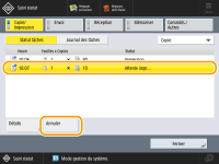 Si vous appuyez sur (Stop) sur le panneau de commande alors que des tâches de copie sont en attente, toutes les tâches de copie sont interrompues, puis le message <<Arrêt>Choisir la tâche de copie à annuler.> et la liste des tâches de copie s'affichent. Vous pouvez sélectionner une tâche de copie dans la liste et l'annuler en appuyant sur <Annuler>. Pour reprendre la copie, appuyez sur <Reprendre copie>. |
