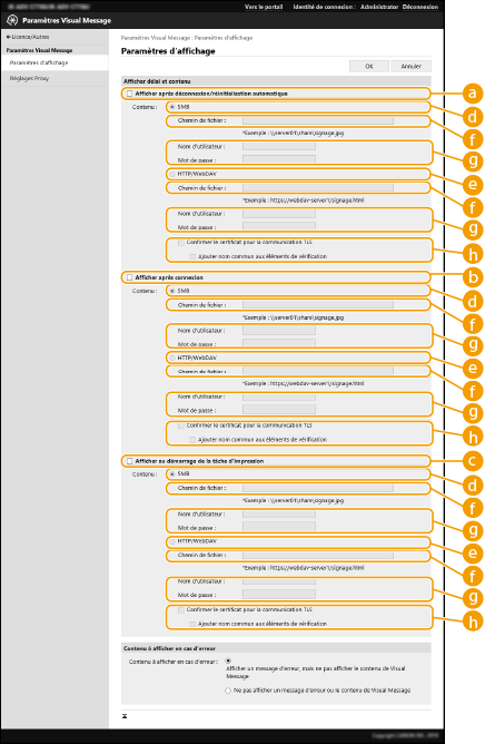 Lorsque la fonction Visual Message est activée, le contenu peut être vérifié à partir de <Visual Message> sur le Accueil, quel que soit le moment indiqué. Le dernier contenu affiché est affiché. Définissez un fichier enregistré sur un serveur de fichiers ou dans une Boîte avancée sur le même réseau que le contenu à afficher. Utiliser comme un simple serveur de fichier Vous pouvez également définir un site Web sur Internet comme contenu via un serveur proxy. Les réglages proxy utilisés pour cette fonction sont les mêmes que les réglages dans <Réglages Proxy>. Si un proxy est établi, le contenu spécifié peut ne pas apparaître. Lorsque cela se produit, établissez une adresse d’exception de sorte que le serveur proxy ne soit pas utilisé. Configuration d'adresses particulières n'utilisant pas un serveur proxy Le contenu est affiché lorsque l'impression démarre si la fonction d'impression en attente forcée est activée et la case [Afficher au démarrage de la tâche d'impression] est cochée. |
