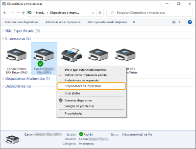 Clique com o botão direito no ícone da impressora da sua máquina e clique em [Propriedades da Impressora].