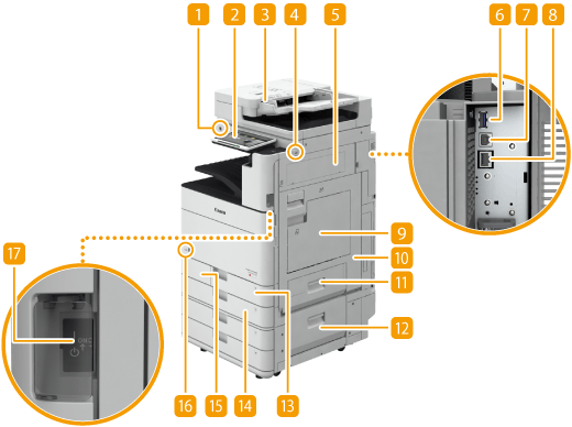 Você pode conectar um dispositivo de memória USB às portas USB localizadas no lado direito da máquina e imprimir dados diretamente do dispositivo de memória USB. Os originais digitalizados usando a máquina também podem ser salvos diretamente em um dispositivo de memória USB.