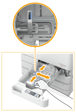 ![]() | Ao pressionar a parte superior da guia frontal, deslize-a para alinhar com o indicador de tamanho do papel carregado. ![]() ![]() |