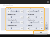 <Sleep Mode Tone>*1 | Som produzido quando a máquina entra em modo de espera ou quando a máquina é DESLIGADA se você configura <Quick Startup Settings for Main Power> como <On>. (Dependendo das situações, a máquina não iniciará rapidamente e o som não será produzido.) |