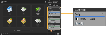 A linha do tempo é uma função conveniente para usar repetidamente as mesmas configurações e destinos das funções como "Copy" e "Scan and Send". O histórico de funções usadas é adicionado automaticamente à linha do tempo e pode ser pressionado para retomar as mesmas configurações.
