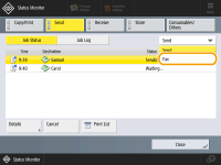 Pressione (Stop) quando houver múltiplos trabalhos de envio para exibir na tela de seleção do trabalho de envio que será cancelado. Se o trabalho de envio que você deseja cancelar não for exibido, pressione <Check Other Jobs> para exibir <Send Jobs>. Selecione o trabalho que você deseja cancelar e pressione <Cancel>.