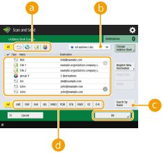 Você pode pressionar <Register to Address Book> para registrar o destino inserido. Configure as condições necessárias e especifique <Name> e <Address Book>. Para informação sobre as configurações, consulte