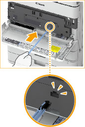 Devolva o bastão de limpeza para a tampa frontal da unidade principal com a ponta virada para a esquerda.