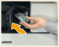 Segure a alça verde no cartucho de grampos e empurre o máximo possível.