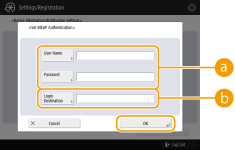<User Name>/<Password>Insira o nome de usuário e a senha de um administrador com privilégios de administrador. Certifique-se de que esse administrador esteja registrado como um usuário na máquina de cliente e no servidor de autenticação usado pela máquina de cliente.
