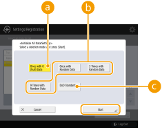 ![]() | Você pode restaurar todas as configurações da máquina para os valores padrões. Todos os dados restantes no dispositivo de armazenamento serão sobrescritos com 0 ou outro valor, impedindo o vazamento quando dados sensíveis são substituídos ou descartados do dispositivo de armazenamento. Selecione o método de sobrescrita e o número de vezes que os dado serão sobrescritos com base no nível de segurança da informação solicitado em seu ambiente. É necessário ter privilégios de administrador para inicializar. |