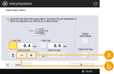 Quando você abre a tela de <Adjust Image Position> novamente após fechá-la pressionando <OK>, os valores na tela voltam a <0>. No entanto, o valor ajustado ainda funciona. Se você repetir etapas, leia o valor das marcas de registro da nova página de teste e insira o novo valor.