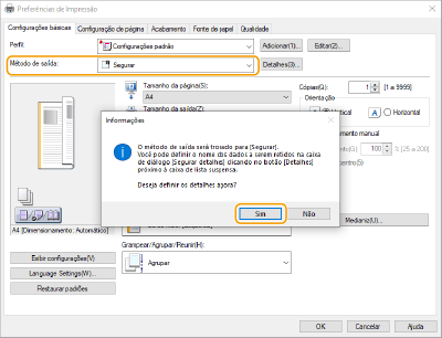 Selecione [Segurar] em [Método de saída] e clique em [Sim].