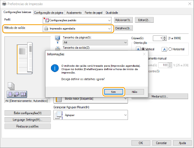 Selecione [Impressão agendada] em [Método de saída] e clique em [Sim].