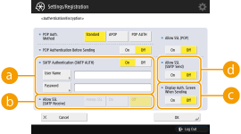2 | Especifique cada item. ![]() <SMTP Authentication (SMTP AUTH)>Para usar autenticação SMTP, pressione <On> e digite o nome de usuário e senha das contas de e-mail especificadas em <User Name> e <Password>. ![]() Nome de usuário e senha <User Name> e <Password> para <SMTP Authentication> também são usados ao encaminhar documentos recebidos. O encaminhamento é executado como "Autenticação Fixa do Dispositivo" independente das configurações de <Information Used for SMTP Server Authentication>. (<Information Used for SMTP Server Authentication>) <Allow TLS (SMTP RX)>Para codificar comunicação usando TLS ao receber e-mails e I-faxes usando o servidor SMTP, pressione <Always TLS> ou <On>. Quando você não quiser receber dados que não sejam codificados, selecione <Always TLS>. <Display Auth. Screen When Sending>Ao enviar e-mails e I-faxes, para exibir a tela com nome de usuário e senha, pressione <On>. <Allow TLS (SMTP TX)>Para codificar a comunicação de/para o servidor SMTP usando TLS, pressione <On>. Quando <On> estiver definido, você poderá confirmar o certificado do servidor TLS durante a comunicação com o servidor e adicionar CN aos itens de verificação. <Confirm TLS Certificate for SMTP TX> ![]() Ao configurar autenticação SMTP Especifique o método de autenticação usando um dos três métodos a seguir. Autenticação fixa de dispositivo Inserindo informações de autenticação ao enviar Registrando informações para cada usuário. Autenticação fixa de dispositivo: quando <User Name> e <Password> inseridos em <SMTP Authentication (SMTP AUTH)> são usados e a tela de autenticação (<Log in to SMTP Server>) não é exibida ao enviar Especifique as configurações como a seguir. <SMTP Authentication (SMTP AUTH)>: <On> <User Name>: digite o nome de usuário. <Password>: digite a senha. <Display Auth. Screen When Sending>: <Off> <Information Used for SMTP Server Authentication>: <Device Settings> Inserindo informações de autenticação ao enviar: quando <User Name> e <Password> digitados em <SMTP Authentication (SMTP AUTH)> são usados e a tela de autenticação (<Log in to SMTP Server>) é exibida ao enviar <User Name> e <Password> digitados em <SMTP Authentication (SMTP AUTH)> são digitados como a informação de autenticação ao enviar. Quando <User Name> e <Password> para <SMTP Authentication (SMTP AUTH)> não forem inseridos (em branco), as informações de autenticação ao enviar também ficarão em branco. Especifique as configurações como a seguir. <SMTP Authentication (SMTP AUTH)>: <On> <User Name>: digite o nome de usuário. <Password>: digite a senha. <Display Auth. Screen When Sending>: <On> <Information Used for SMTP Server Authentication>: <Device Settings> Registrando informações para cada usuário: quando <Register Info. for Each User> for usado e a tela de autenticação (<Log in to SMTP Server>) não for exibida ao enviar Autenticação SMTP é executada usando o nome de usuário e a senha registrados no dispositivo local. Especifique as configurações como a seguir. <SMTP Authentication (SMTP AUTH)>: <On> <Display Auth. Screen When Sending>: <Off> <Information Used for SMTP Server Authentication>: <Register Info. for Each User> |