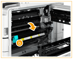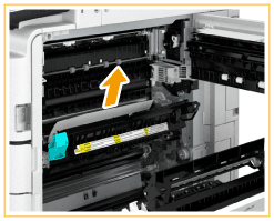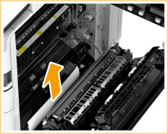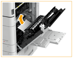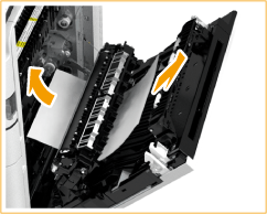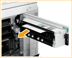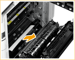 | Se o papel estiver encravado, puxe-o cuidadosamente na direção da seta. Se não puder remover o papel, retorne a unidade de fixação à posição original e puxe o papel cuidadosamente pela parte inferior. |