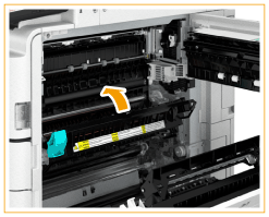 | Segure a alavanca verde (  ) e abra a unidade de saída. A unidade de saída abre como indicado no diagrama. |