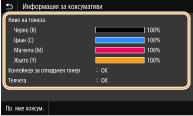 Използвайте процедурата по-долу, за да проверите оставащото количество в тонер касетите, касетата за отпадъчен тонер и телчетата за телбод.
