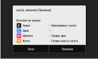 Може да възникне неизправност. Може да е поставена тонер касета различна от Canon или тонер касета с грешен цвят. За да използвате тази касета, натиснете [Приемам]. Източник на грешка