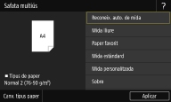 Si la pantalla que es mostra més amunt no apareix quan carregueu paper.Si sempre carregueu el mateix paper a la safata multiús, podeu ometre les operacions d'ajust del paper desant la mida i el tipus de paper com a opció predeterminada. No obstant això, quan es desa l'opció predeterminada, la pantalla que es mostra més amunt no apareix. Per visualitzar la pantalla, seleccioneu <Especificar en carregar paper> (Correcció de la mida i el tipus de paper que cal fer servir a la safata multiús).