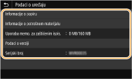 Prikazuje status uređaja, kao što je količina preostalog papira ili tonera u spremnicima tonera.