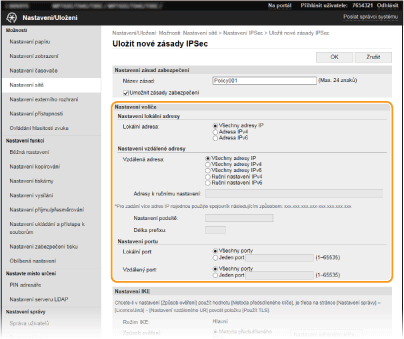 Vyberte sadu IPSec pro všechny IP pakety, které se odesílají do adresy IPv4 přístroje nebo z ní.