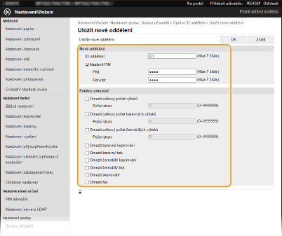 Uložte ID oddělení a nastavte pro ně kód PIN. Uložte všechna ID oddělení, která chcete spravovat.