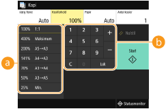 Du kan forstørre eller reducere kopier ved at bruge et forudindstillet kopiforhold som f.eks. <A5->A4> eller ved at indstille et brugerdefineret kopiforhold i et interval på 1 %.