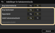 Giver dig mulighed for at udskrive Rapporter over modtagelsesresultater, hver gang et dokument gemmes i hukommelsen. Hvis du vil udskrive rapporter, skal du vælge <Til>. Du skal også angive <Resultatrapport for modtagelse> til <Til>.