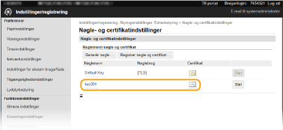 Det er ikke muligt at slette en nøgle og et certifikat, hvis det aktuelt bruges til et formål, f.eks. når "[TLS]" eller "[IEEE 802.1X]" vises under [Nøglebrug]. I dette tilfælde skal du deaktivere funktionen eller erstatte nøglen og certifikatet, før du sletter det.