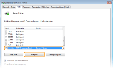 Du kan ikke slette en port, der i øjeblikket er konfigureret som printerporten. Hvis du vil slette denne port, skal du vælge en anden port og klikke på [Anvend] for at konfigurere den som den nye printerport og derefter slette den oprindelige.
