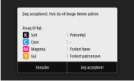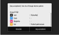 Hvis du vil fortsætte med at bruge tonerpatronen, skal du trykke på <Jeg accepterer>. Hvis du bruger denne mulighed, garanteres maskinens funktion ikke.