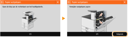 In sommige gevallen worden, wanneer een fout optreedt, instructies weergegeven over hoe u moet reageren. Volg in dat geval de aanwijzingen op het scherm om het probleem op te lossen. Het scherm dat wordt weergegeven wanneer er zich een papierstoring voordoet, wordt hieronder getoond als voorbeeld.
