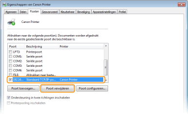 U kunt een poort die momenteel is geconfigureerd als printerpoort niet verwijderen. Om deze poort te verwijderen, selecteert u een andere poort en klikt u op [Toepassen] om deze als nieuwe printerpoort te configureren. Vervolgens verwijdert u de oorspronkelijke poort.