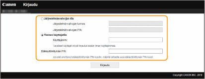 Voit käyttää kaikkia Etäkäyttöliittymän toimintoja ja asetuksia. Syötä oikea tunnus kohtaan [Järjestelmänvalvojan tunnus] ja PIN-koodi kohtaan [Järjestelmänvalvojan PIN].